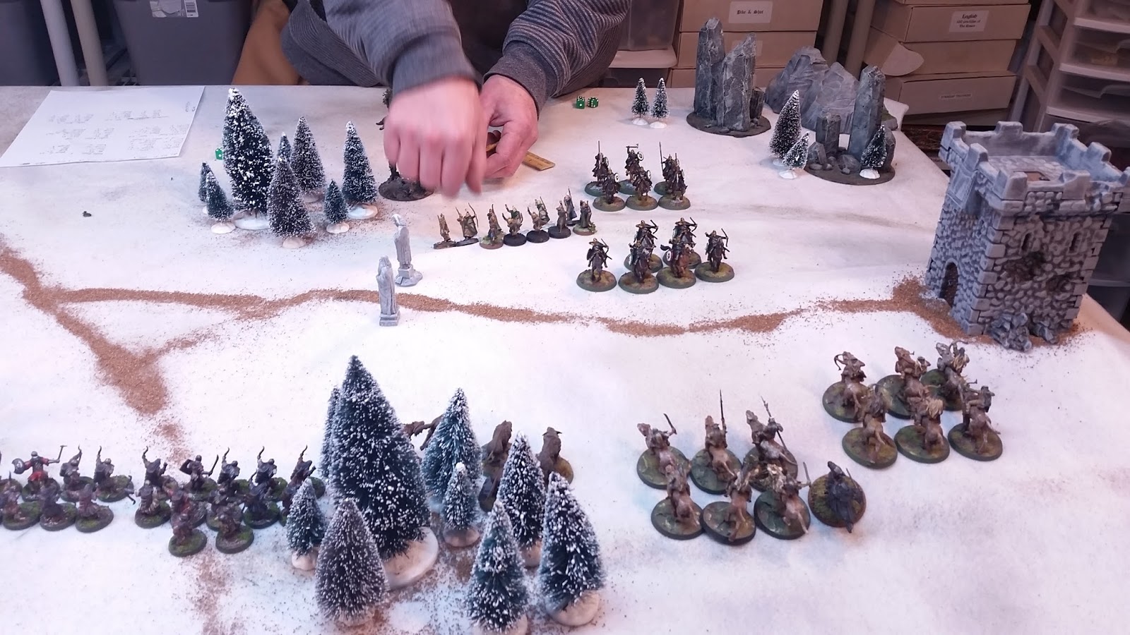 The Ent would try again and be beaten off with 2 more wounds, but not flee. The Elves are now coming up to my Orc Foot. 12 dice is a lot of shots.